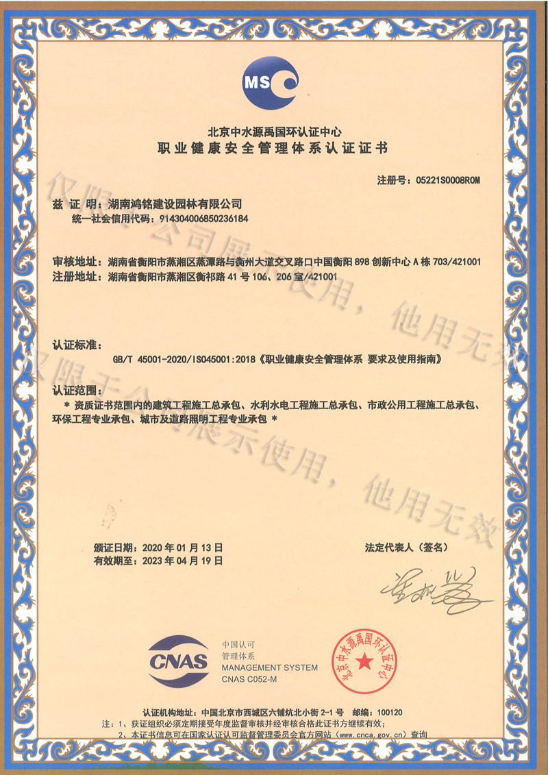 职业健康安全体系认证证书